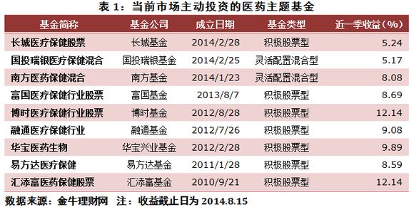今年以來,盡管市場(chǎng)震蕩,成長(zhǎng)股起伏,藍(lán)籌席卷,醫(yī)藥醫(yī)療主題基金卻始終能抗住風(fēng)浪,穩(wěn)健前行。進(jìn)入2014年,在政策大力扶植和行業(yè)基本面優(yōu)異的背景下,這一主題大家庭又新添了3位成員,分別為南方醫(yī)藥保健混合、國投瑞銀醫(yī)療保健混合、長(zhǎng)城醫(yī)療保健股票。目前,市場(chǎng)上主動(dòng)投資的醫(yī)藥醫(yī)療主題基金已達(dá)到9只。
